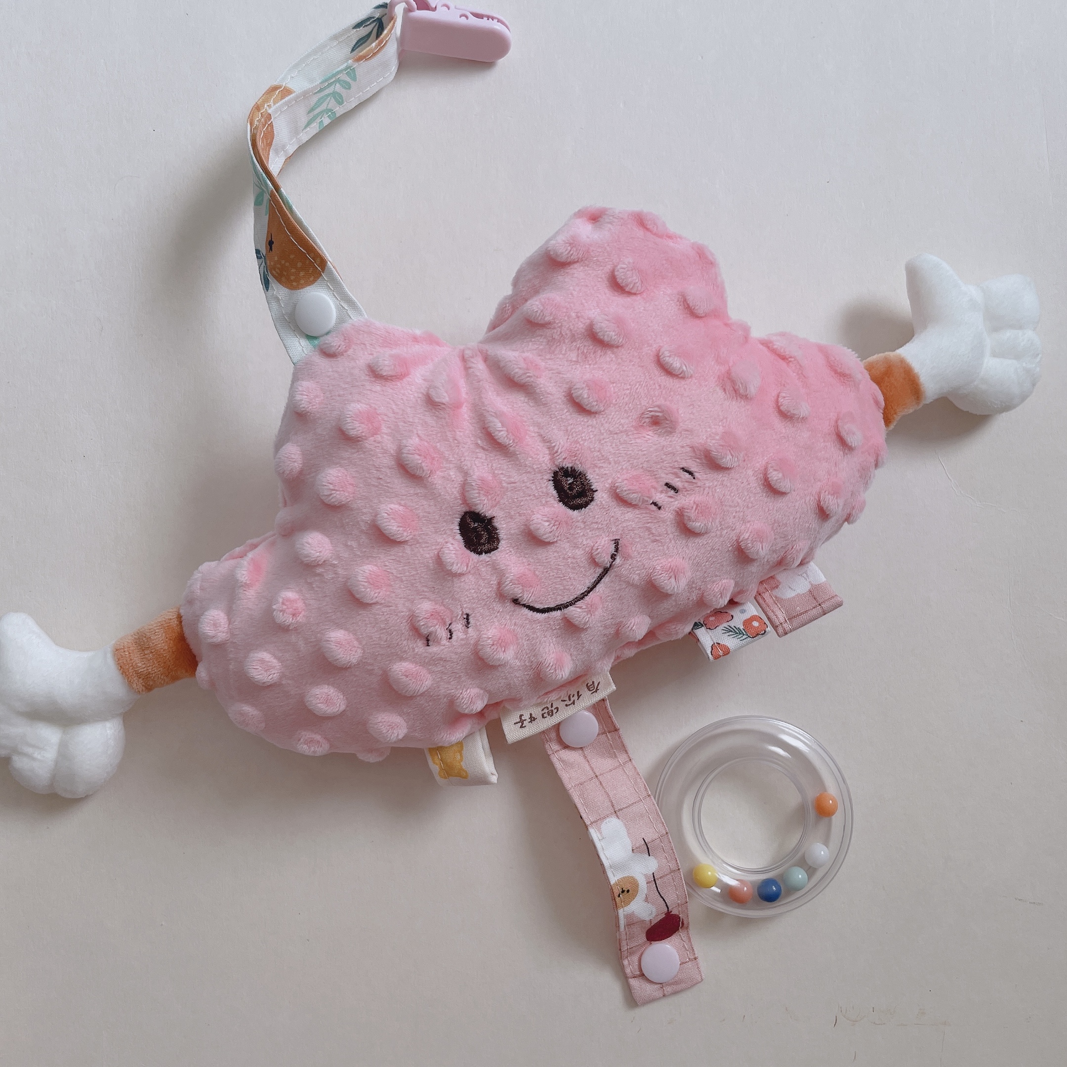 小配件會有:手搖鈴/安撫手手或是拉拉腳腳/三個布條