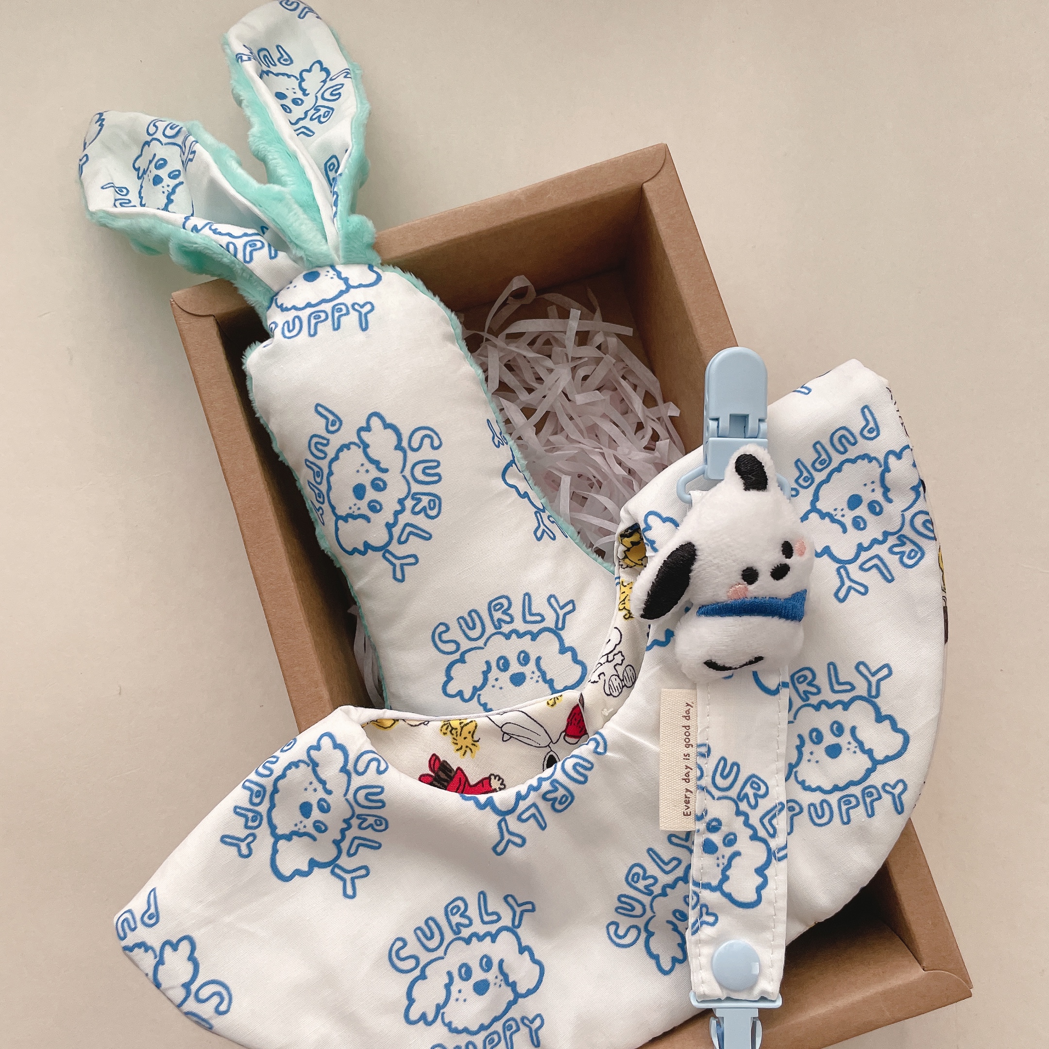內容物:娃娃奶嘴鏈 / 雙面八層紗圍兜 / 啾啾安撫兔